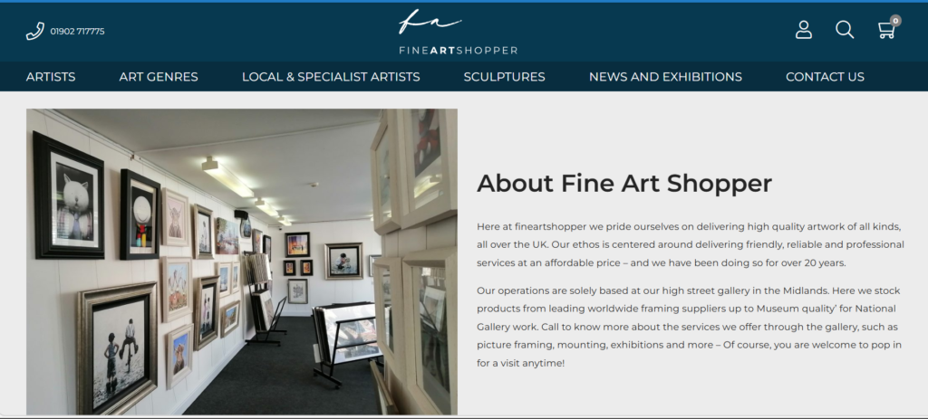 ‘Fine art shopper’ is a picture frame business, initially suppling hotels, show houses, the leisure and licenced industries. Founded in 1999 and since branching out into retail occupying it’s present high street gallery ‘The Framer’s Gallery’.